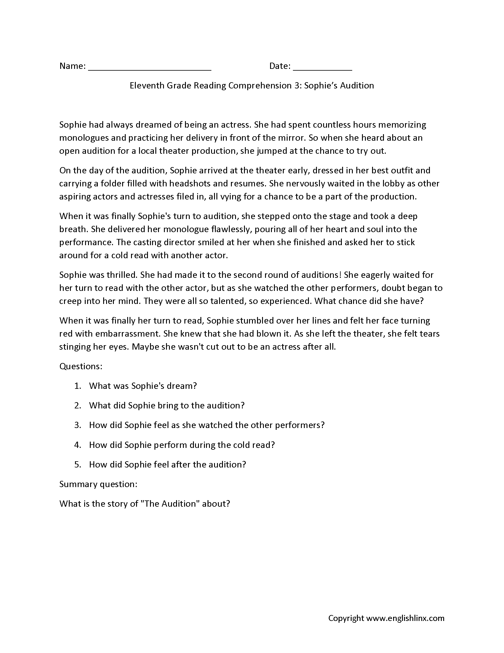 Reading Comprehension Worksheets Eleventh Grade Reading Comprehension Worksheets
