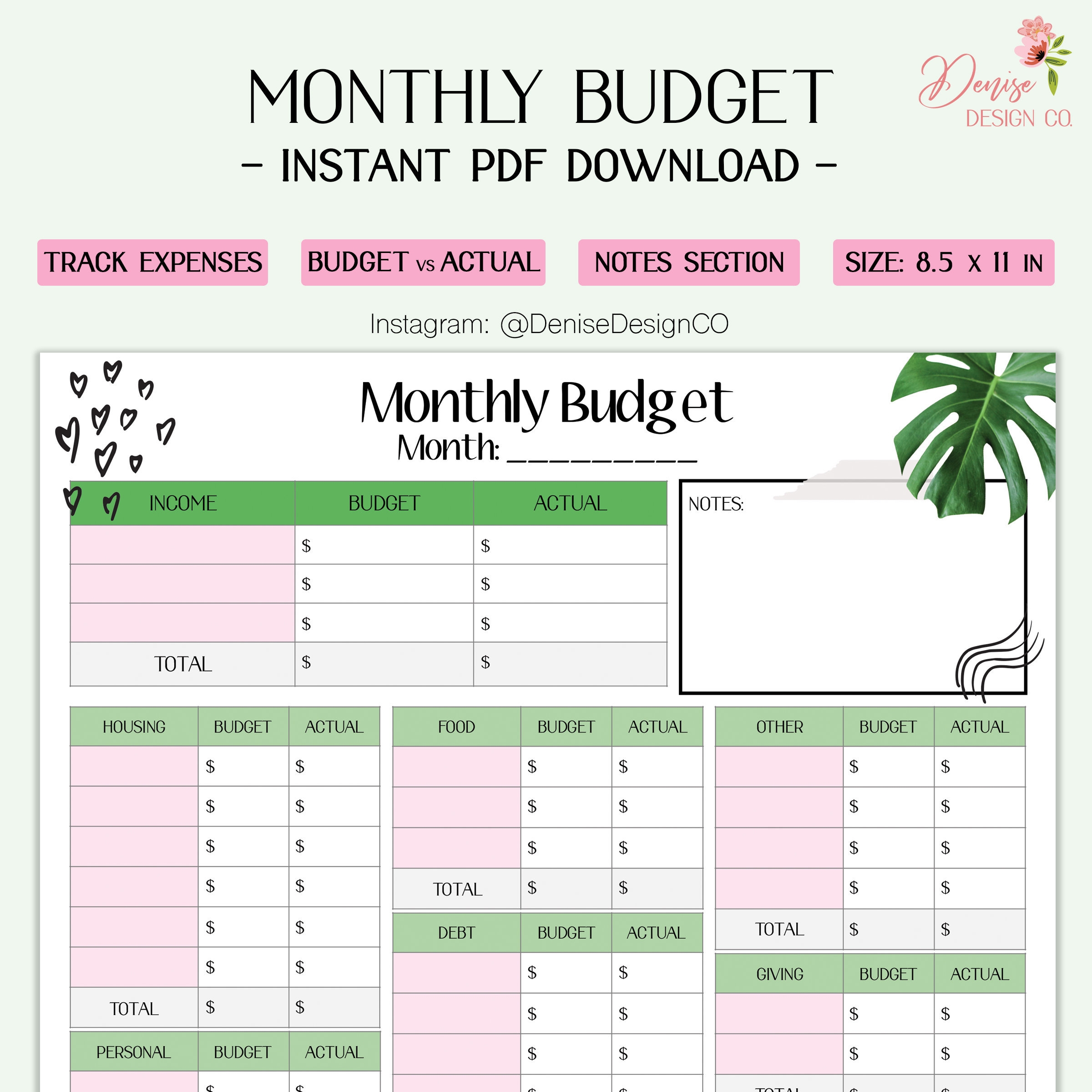 Printable Monthly Budget Sheet Income Budgeted Vs Actual Overview U0026 Notes Doodle Print Etsy