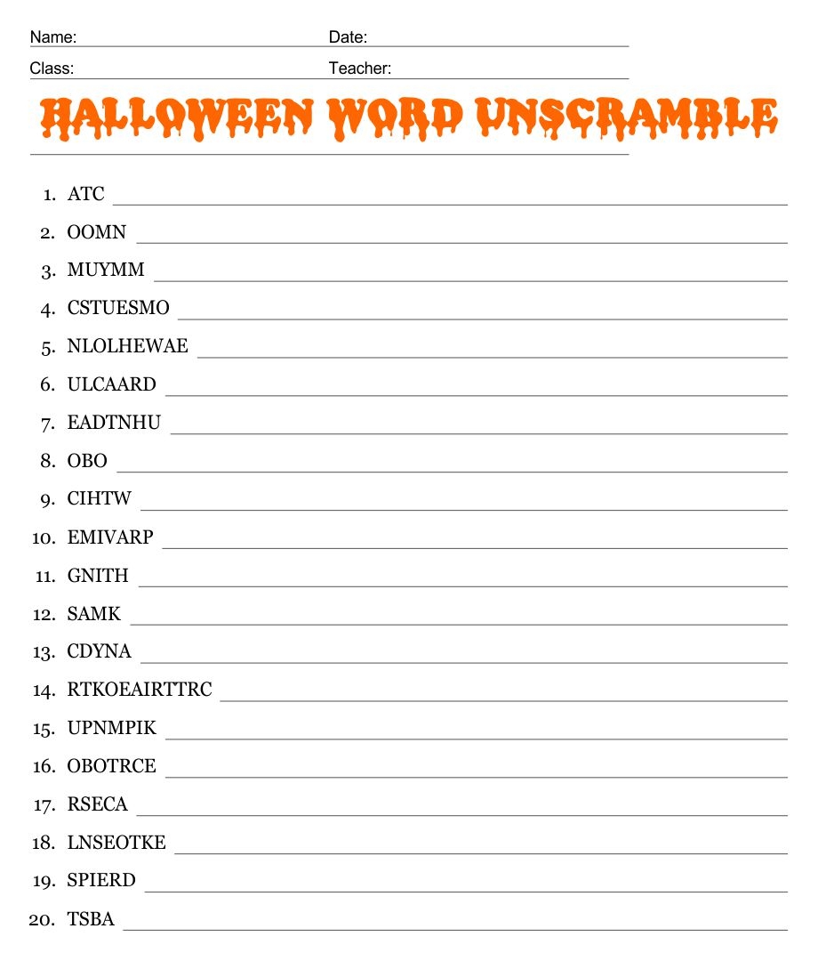 Free Printable Halloween Unscramble Words Worksheets