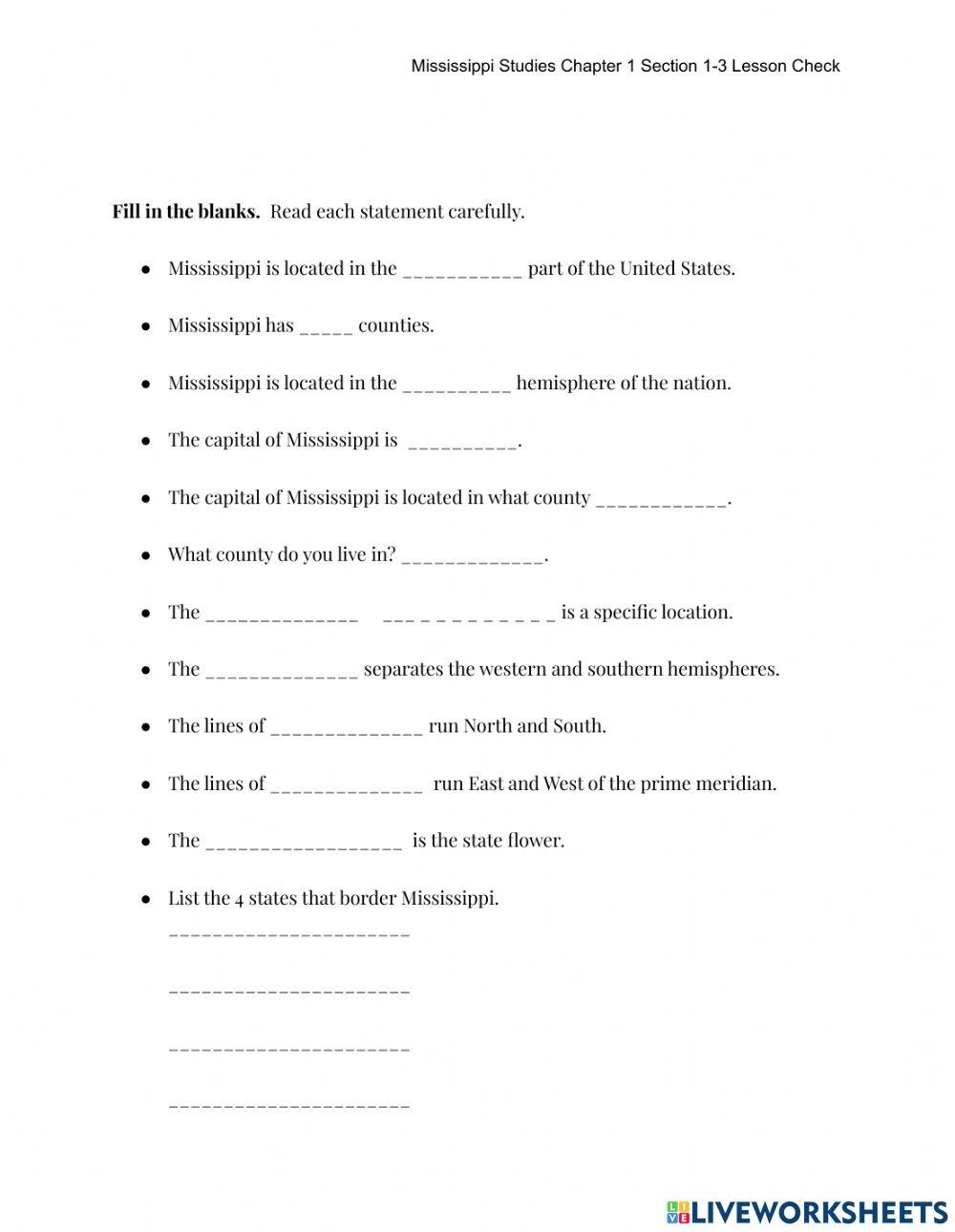 Mississippi Studies Chapter 1 Section 1 3 Quiz Worksheet Live Worksheets Library