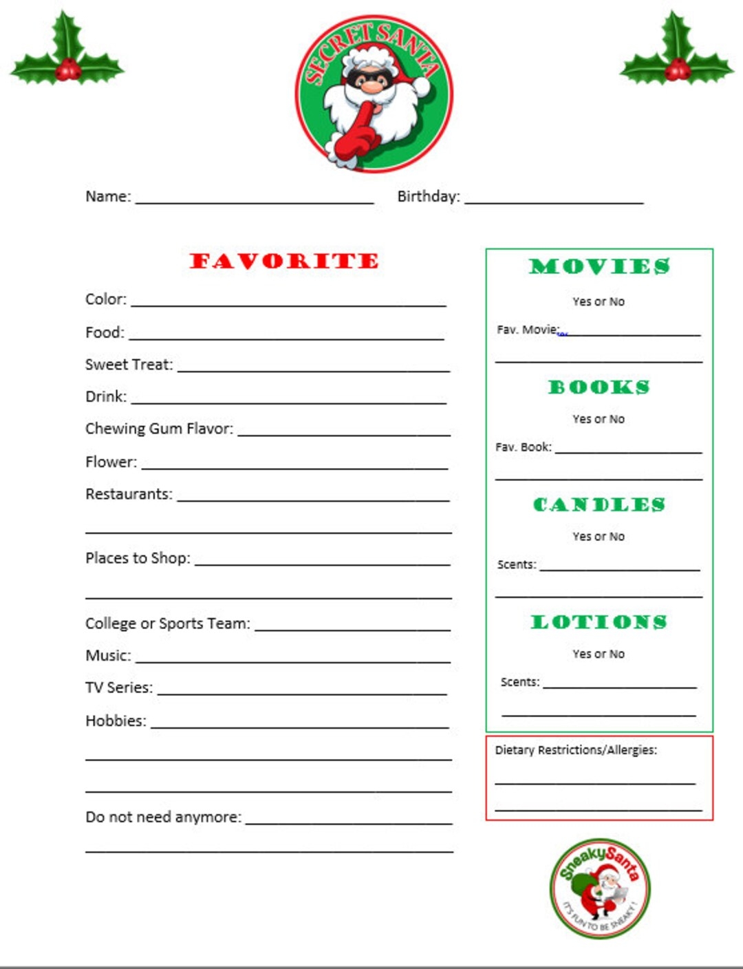 Secret Santa Form Etsy